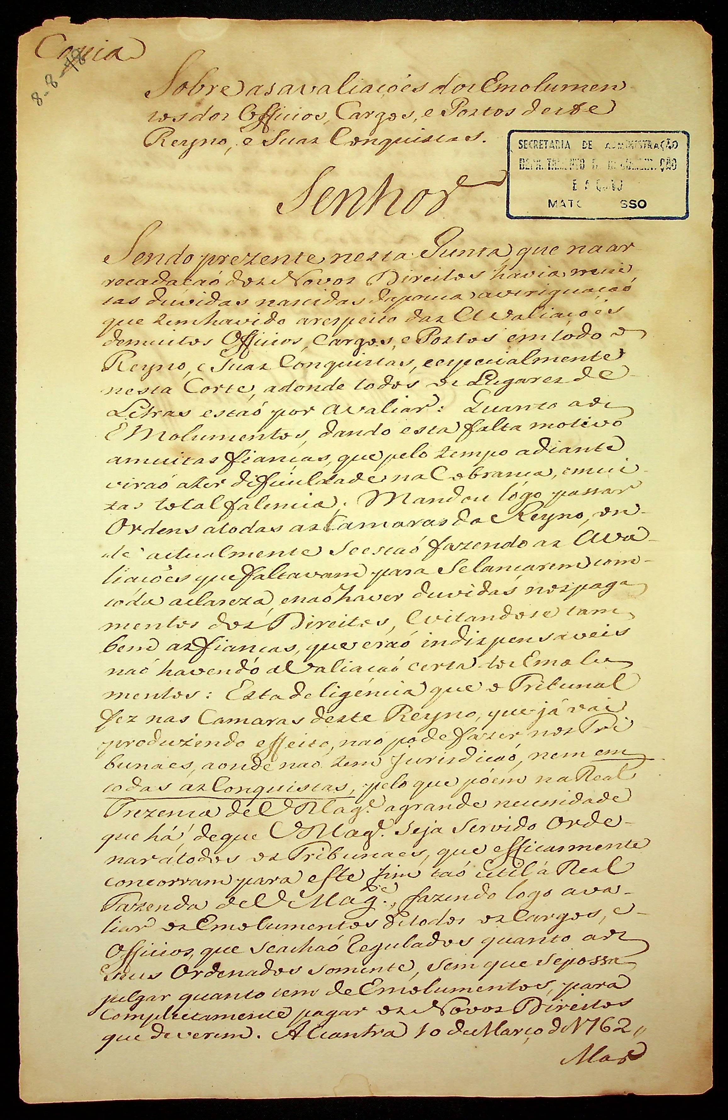 RESOLUÇÃO (Cópia) passada pelo Rei ordenando sobre as avaliações dos emolumentos dos ofícios, cargos e postos deste reino e suas conquistas.