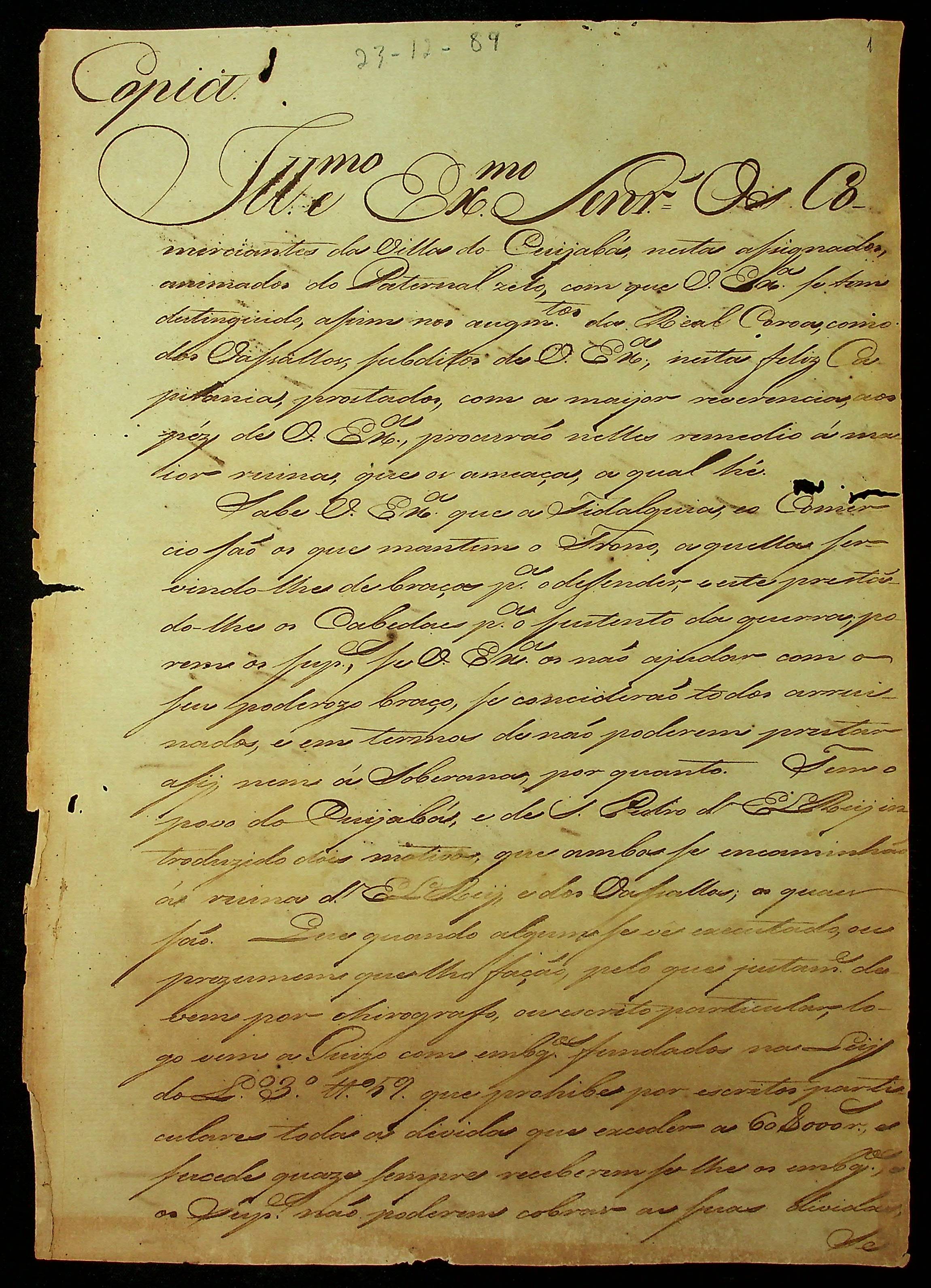 REPRESENTAÇÃO (Cópia) dos Comerciantes da Vila do Cuiabá e Julgado de São Pedro D'El Rei ao [Governador e Capitão-General da Capitania de Mato Grosso Luiz de Albuquerque de Melo Pereira e Cáceres].