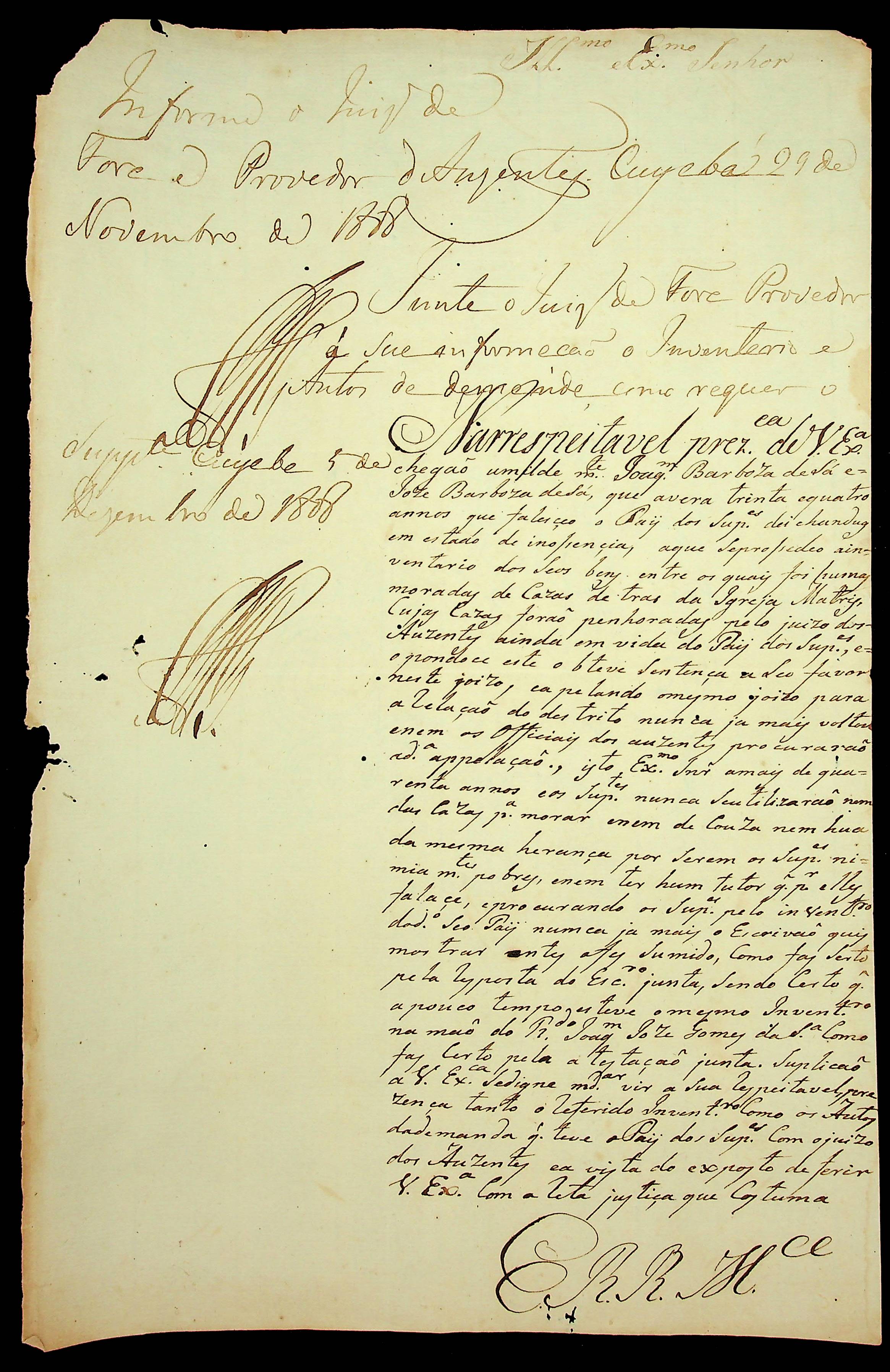 REPRESENTAÇÃO de Joaquim Barbosa de Sá e José Barbosa de Sá ao [Governador e Capitão-General da Capitania de Mato Grosso João Carlos Augusto D’Oeynhausen e Gravemberg] contra o Juizado e Provedoria dos Órfãos.
