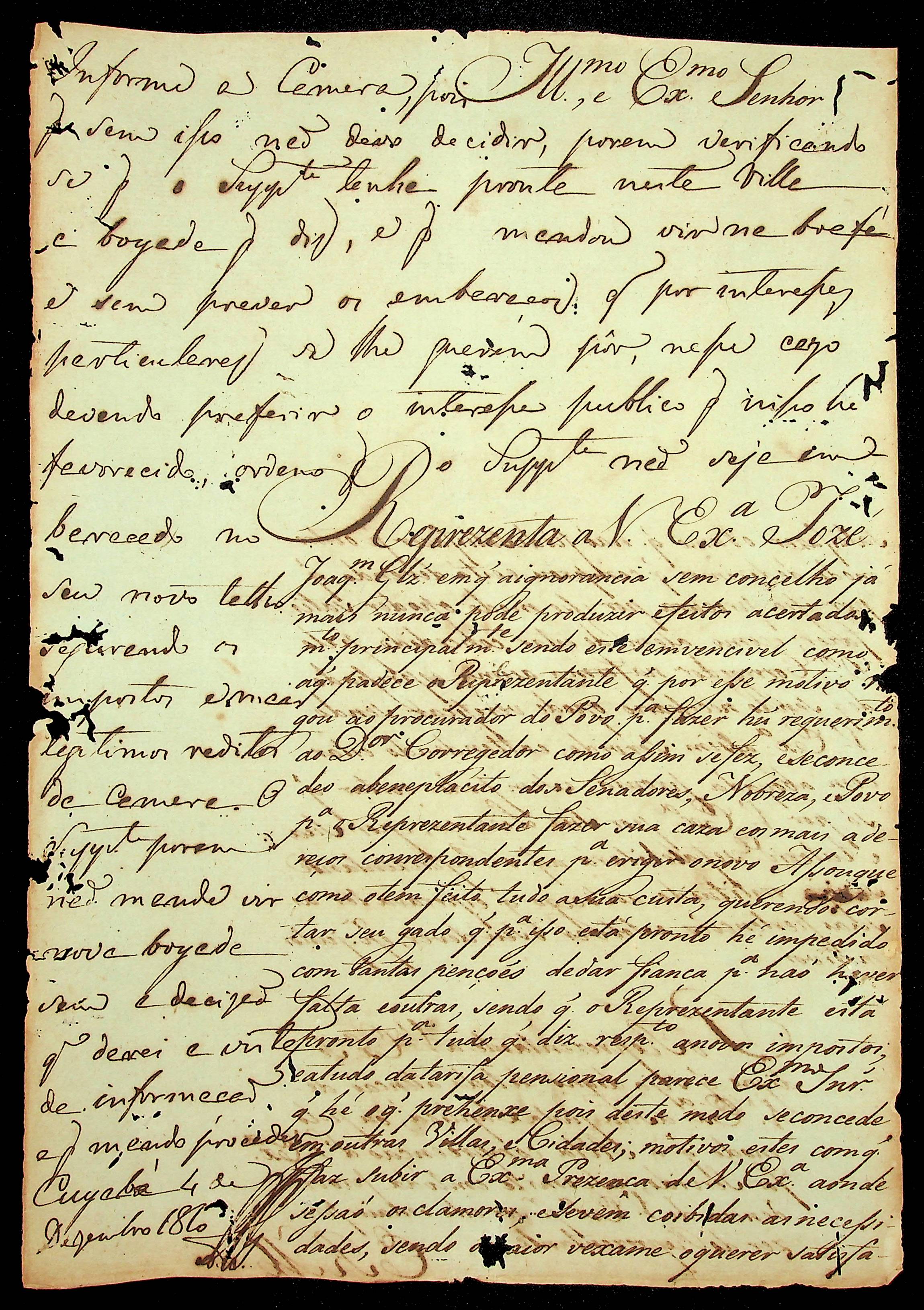 REPRESENTAÇÃO de José Joaquim Gonçalves para o Governador e Capitão-General da Capitania de Mato Grosso João Carlos Augusto de Oyenhausen e Gravenberg.