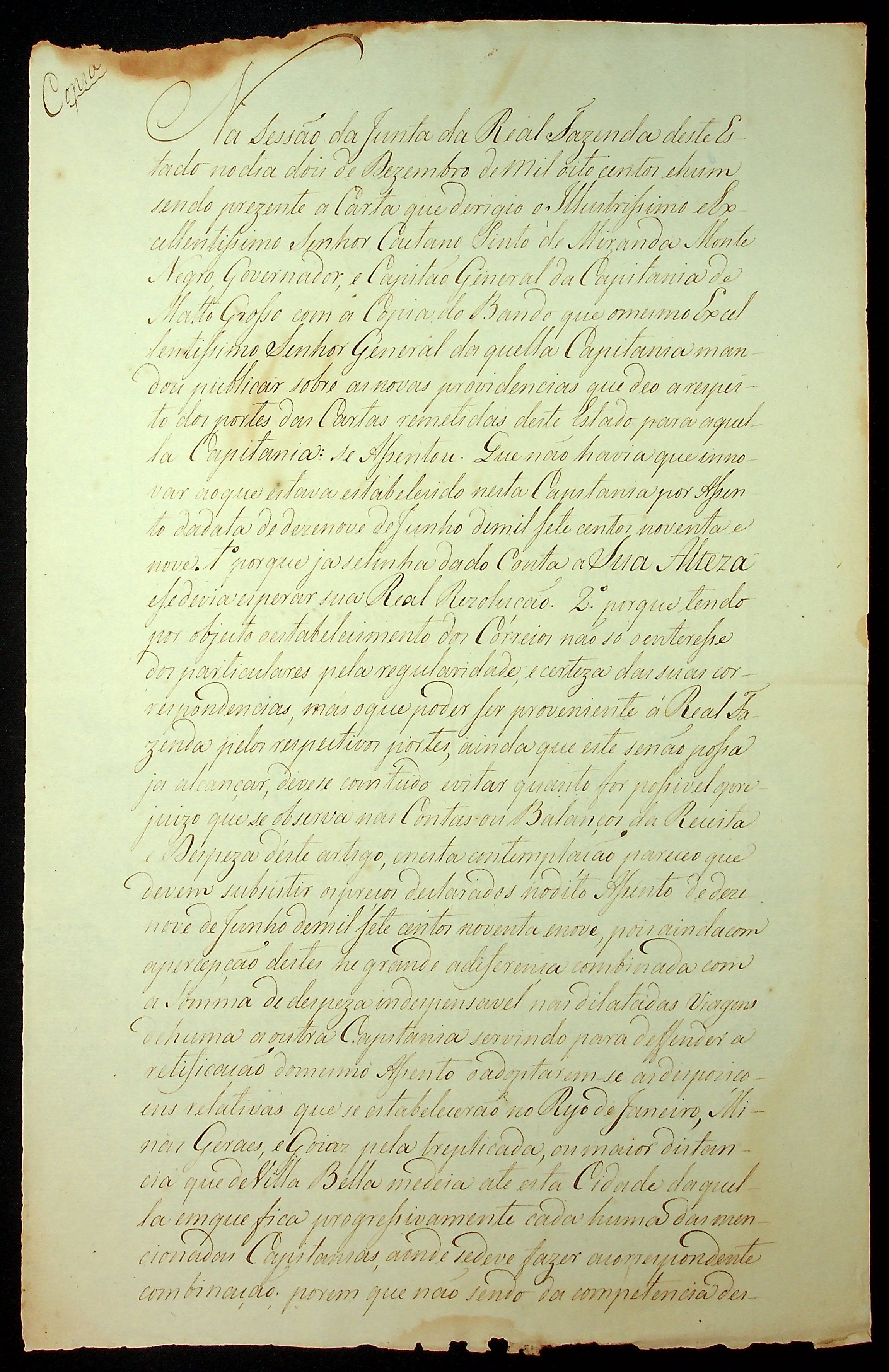 TERMO (Cópia) da Junta da Real Fazenda do Pará sobre as deliberações tomadas pelo Governador e Capitão General da Capitania de Mato Grosso Caetano Pinto de Miranda e Montenegro.