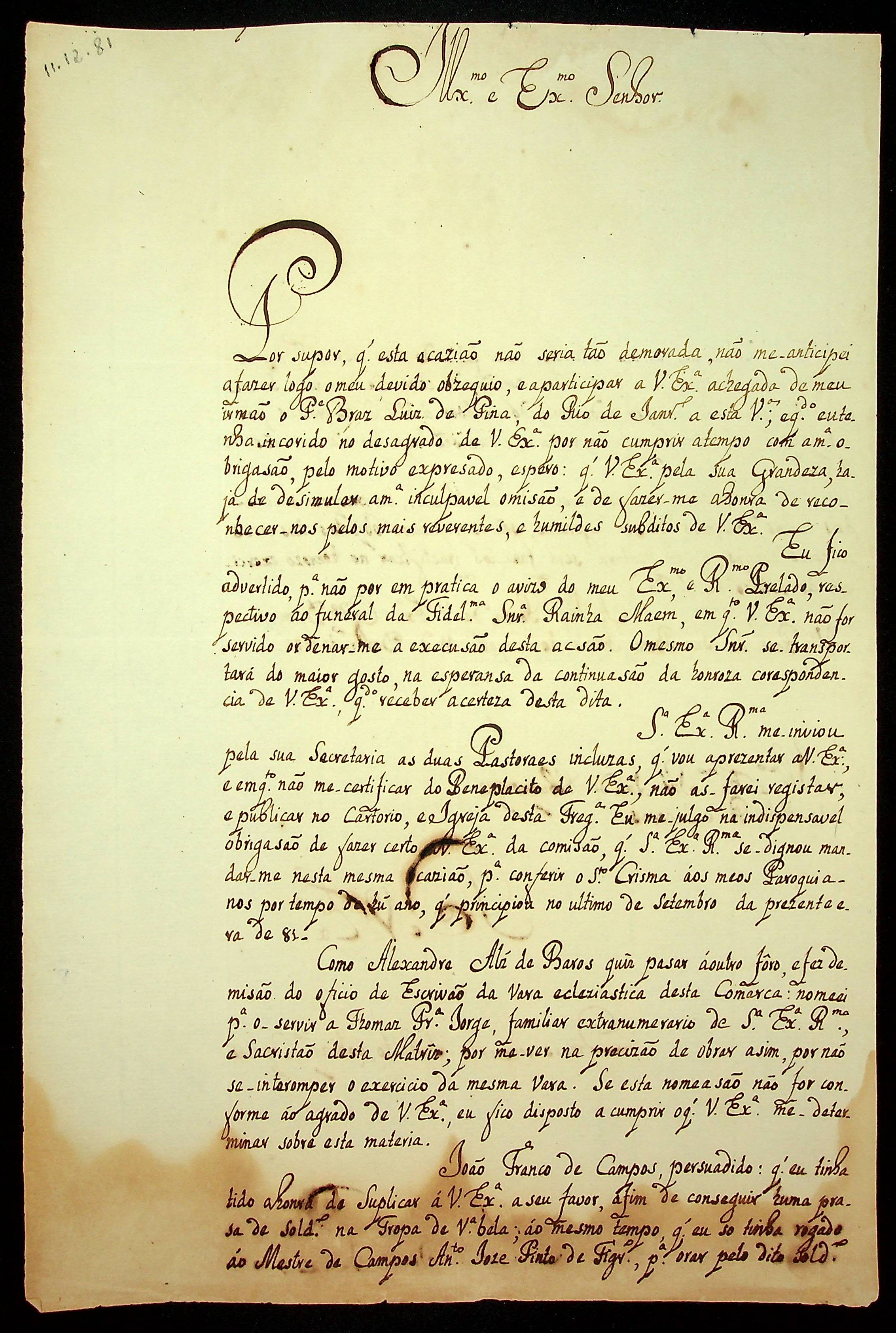 CARTA do Capelão Manoel Bruno Lima ao [Governador e Capitão-General da Capitania de Mato Grosso] Luiz de Albuquerque de Melo Pereira e Cáceres.