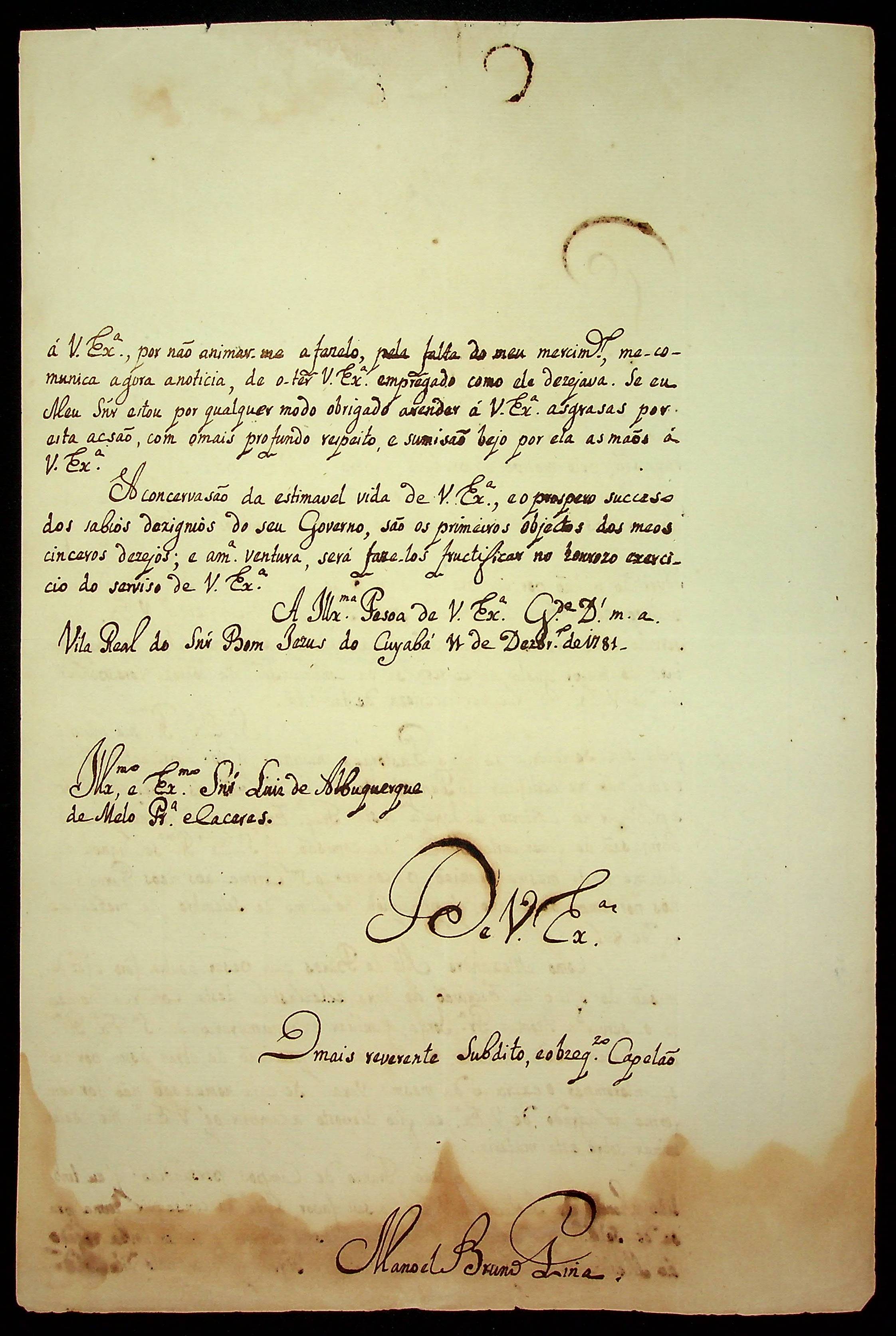 CARTA do Capelão Manoel Bruno Lima ao [Governador e Capitão-General da Capitania de Mato Grosso] Luiz de Albuquerque de Melo Pereira e Cáceres.